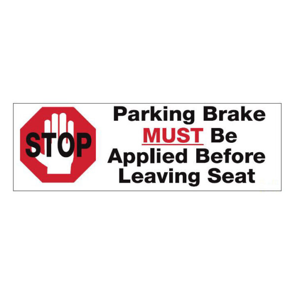 Parking brake must be applied sticker, 190x65mm, printed on white vinyl.